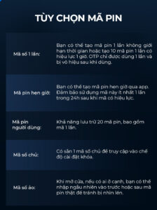 - Chức năng mã số ảo: Cho phép nhập ngẫu nhiên số trước và sau mã số thật để ngăn chặn kẻ gian nhìn lén từ bên ngoài.