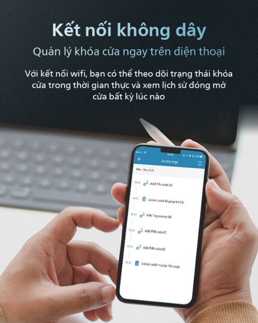Khóa thông minh Philips 9300 có khả năng kết nối với mạng không dây, cho phép bạn quản lý từ xa việc sử dụng khóa cửa và giám sát trạng thái khóa cửa theo thời gian thực. Bạn có thể truy cập vào nhật ký sử dụng khóa cửa bất cứ lúc nào để thực hiện việc quản lý khóa cửa thông minh.