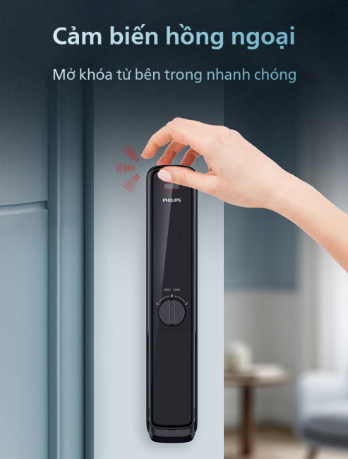 Thường các sản phẩm khóa thông minh hiện nay chỉ có hai phương thức mở khóa từ bên trong là sử dụng nút bấm hoặc núm vặn. Tuy nhiên, khóa thông minh Philips 9300 còn có thêm tính năng cảm biến hồng ngoại cực kỳ hiện đại. Khi chạm vào khu vực cảm biến, khóa sẽ tự động nhận diện và cửa sẽ ngay lập tức được mở. Bạn chẳng cần làm thêm bất kỳ thao tác gì với khóa, mở cửa chỉ với một chạm.
