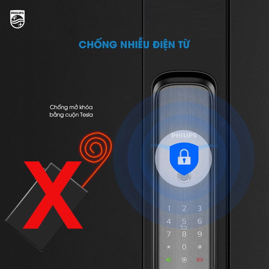 Khóa cửa thông minh Philips DDL702E cũng được trang bị 4 phương thức mở cửa cao cấp và tiện lợi hàng đầu hiện nay, bao gồm: vân tay, mã số, thẻ từ và chìa cơ. Đặc biệt, khóa còn có khả năng chống nhiễu điện từ đã được thử nghiệm trên cuộn Tesla, loại bỏ hoàn toàn khả năng bị phá bằng công nghệ cao.